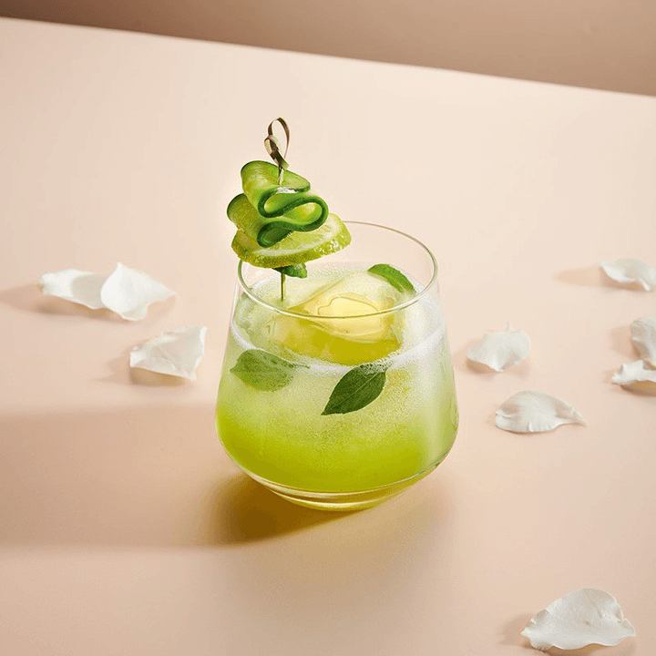 • In a shaker, muddle the cucumber and basil with agave