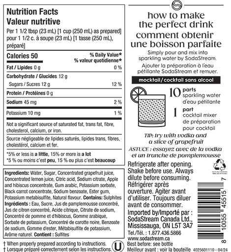 La saveur de pamplemousse et de fleur de sureau offre un subtil goût floral à l’agrume pour créer la gorgée parfaite pour vos papilles. Si vous souhaitez bonifier d’une touche d’originalité la saveur de pamplemousse et de fleur de sureau, ajoutez du gin ou le spiritueux de votre choix, de la fleur de sureau et une tranche de pamplemousse. À consommer avec modération. Améliorez vos talents de barman à la maison et impressionnez vos invités avec les mélanges Crafted Mixers de SodaStream. Faites toujours pétiller l’eau avant d’y ajouter une saveur.