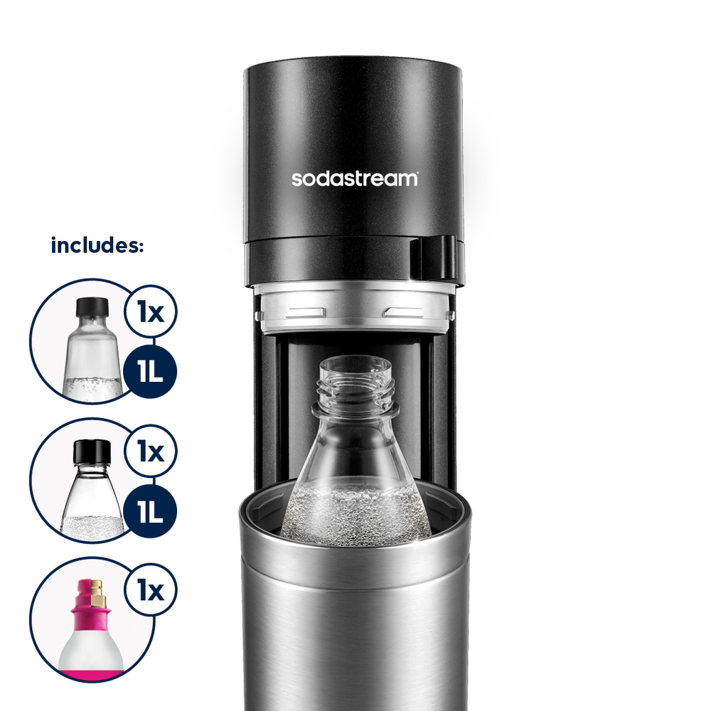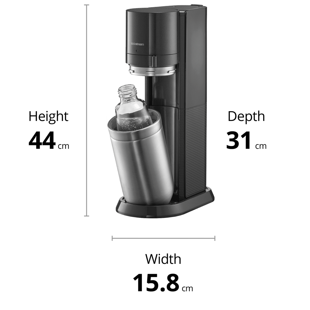 Conception compacte pour glisser facilement l'appareil dans une armoire de la cuisine. Comprend des bouteilles de 1 litre en plastique et en verre lavables au lave-vaisselle. Nouvelle technologie Quick Connect facile et intuitive pour une insertion rapide des cylindres de CO2.