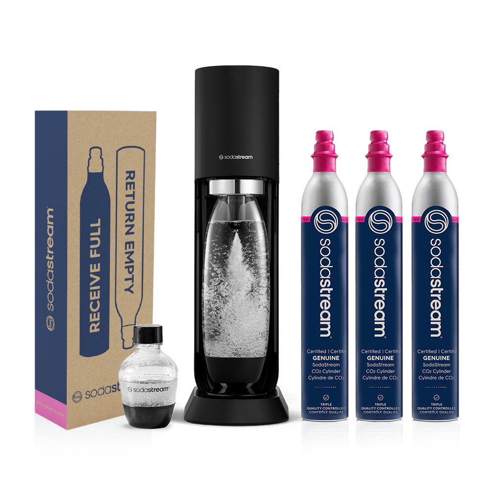 This bundle includes 1 SodaStream™ Sparkling Water Maker* + 1L DWS carbonating bottle + 3 Quick Connect CO2 Cylinders (2 Exchange cylinders + 1 Spare cylinder).