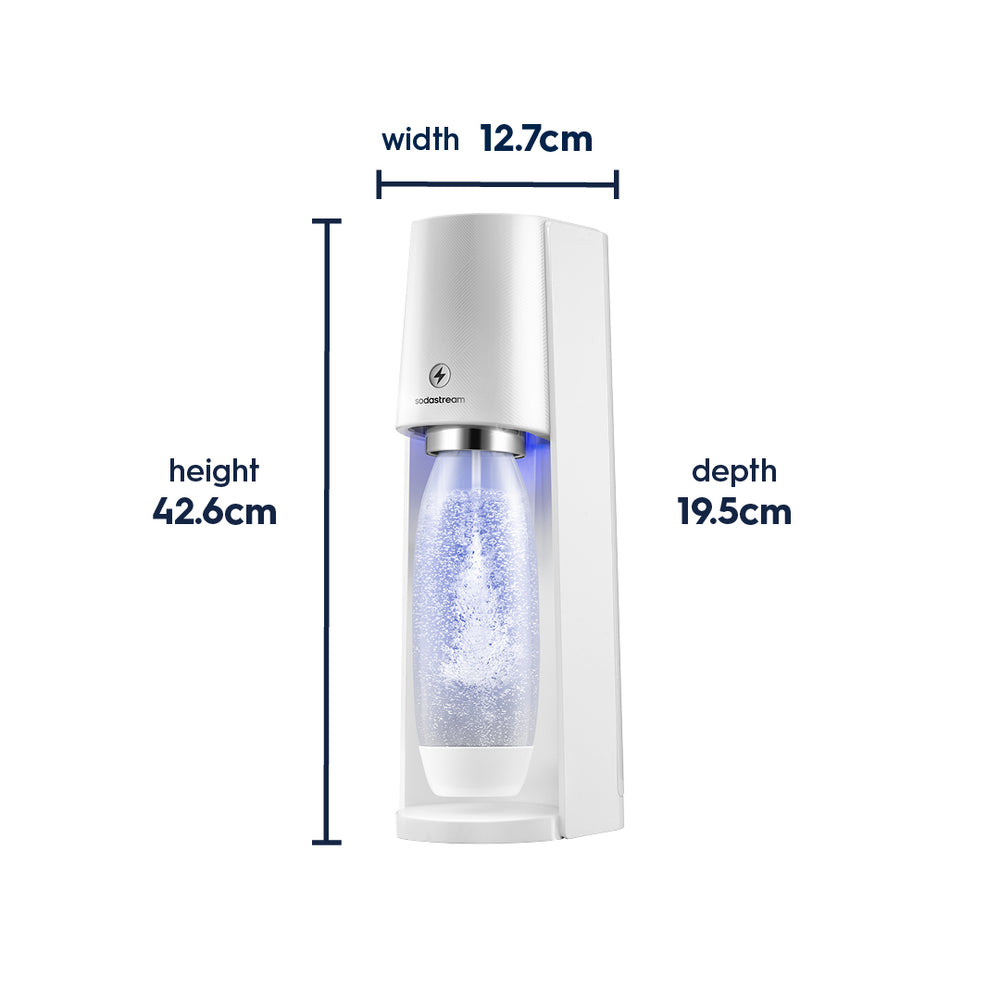 The E-Terra electric sparkling water maker turns water into sparkling water in seconds with just one touch offering an automated and seamless experience. The three preset carbonation levels allow you to control your carbonation and make your beverage just the way you want it. While you carbonate, a blue light illuminates your water to let you know you it’s bubbling.